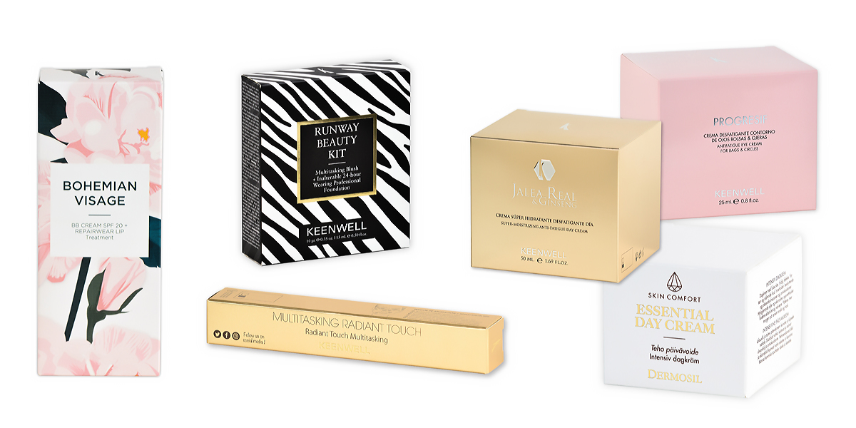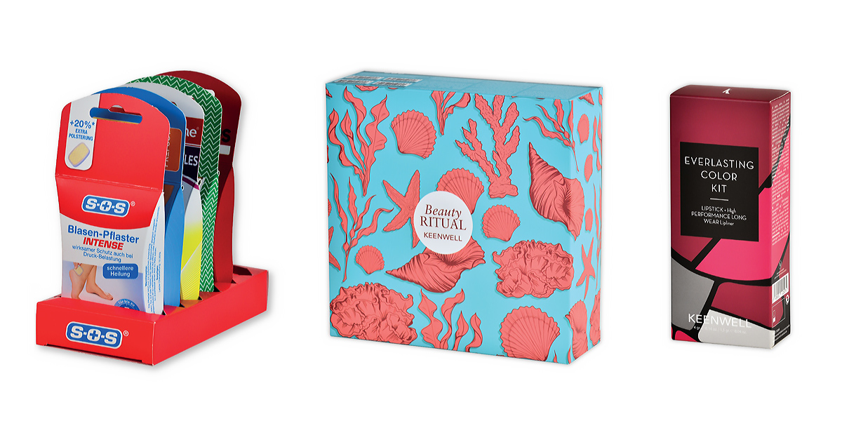Folding boxes come in various printable designs, sizes, and shapes and can also be combined with metalized base materials or paper, various types of lamination, and hot-foil stamping, giving them a stylish and premium feel.